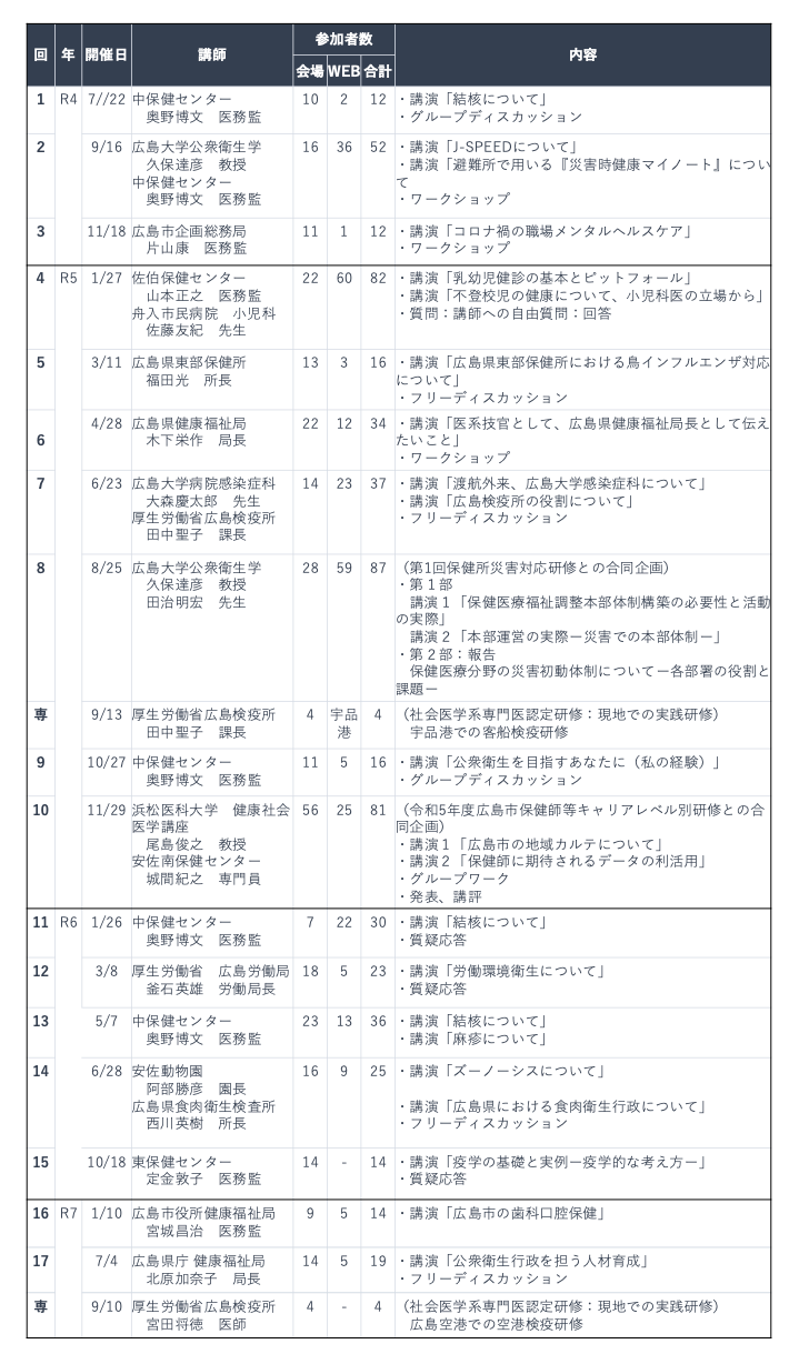 「公衆衛生」をキーワードに、県内の公衆衛生医師を中心とし、関係するすべての職種が参加できる、ハイブリッド研修です。参加者同士で知識・技術を高めつつ、有機的なつながり作り・生涯教育・人材育成を目的としています。企画・運営も、人材育成の一環として主に若手メンバーが行います。
